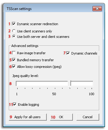 - Apply for all users: By pressing this button the settings configured will be applied to all terminal server users which use TSScan 3. This can only be used by users in the Administrators group