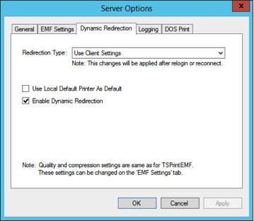 - Use Client Settings: When this redirection type is selected, then the dynamic redirection checks the local client options on what printers to redirect. On your local client workstation open the Client Options from the start menu, and you will now find a new Dynamic Redirection tab where you can define what devices you would like to redirected. Please note that server options always take precedence so if for example you have selected printers to redirect but dynamic redirection is disabled on the server no devices will be redirected.