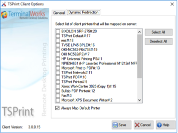 - Redirect All Printers: This type tells the dynamic redirection to map all your local printers to the terminal server session.