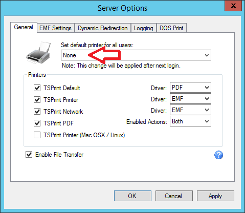 To do that, open up the TSPrint Server Options and on the "General" tab, set the value of the "Set default printer for all users" to: "None"