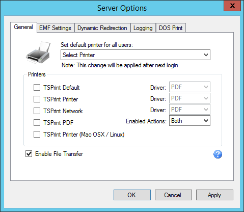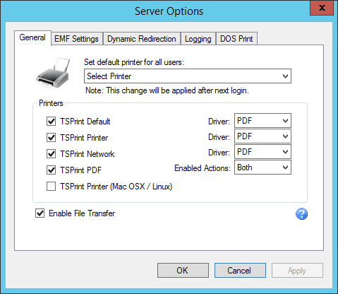 First, we need to disable the default ones generated by the server part installation. So once again, launch the TSPrint Server Options and remove the checkmarks from the TSPrint Default, TSPrint Printer, and the TSPrint PDF, so it matches the settings shown on the image below. Apply the changes.