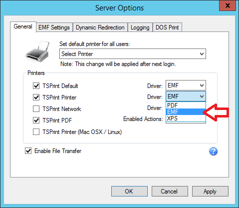 If you wish to try out EMF as a driver, open up the TSPrint Server Options and change the TSPrint Printer and TSPrint Default from PDF to EMF.
