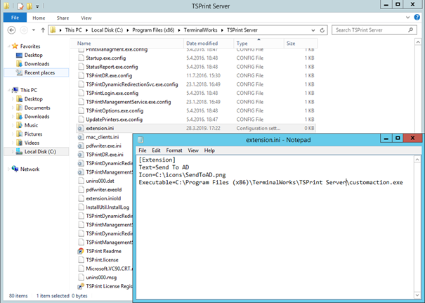 What you have to do here is to navigate to the installation folder of the TSPrint Server: "<ProgramFiles>\TerminalWorks\TSPrint Server" and create a file called "extension.ini"
