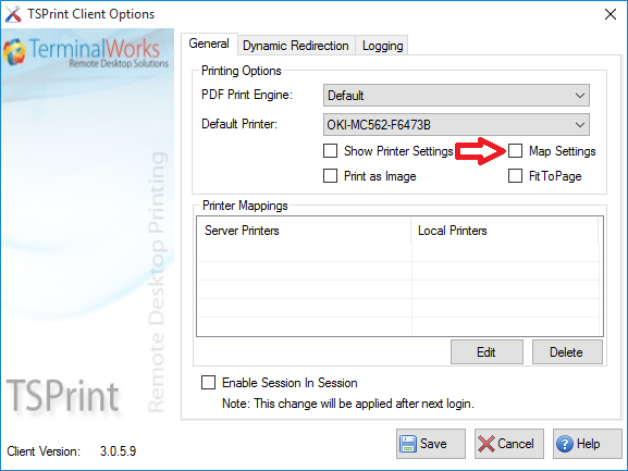 This one is very simple. For TSPrint to only apply the local printer settings and disregard the server settings, all you have to do is open the TSPrint Client Options and remove the checkmark from the Map Settings checkbox, as shown in the image below.